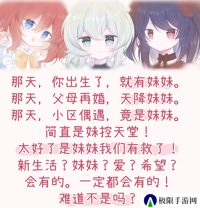 就这三妹同框的设定,不得不说男主吃的是真好,用作者的话讲就是:太好了,是妹妹我们有救了。