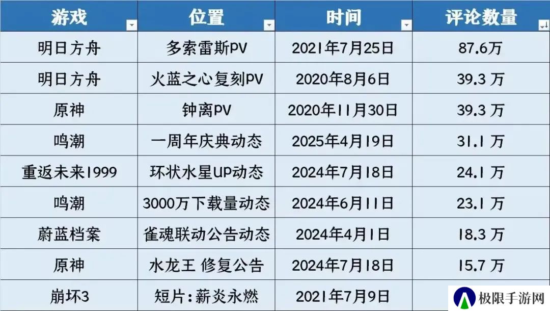 这是个啥榜单呢?简单来说,就是个节奏榜单,节奏越大,评论就越多。而且此榜单已经过时了,因为《鸣潮》的评论数已经超过了53万,目前朝着第一《明日方舟》多索雷斯PV直冲而去。