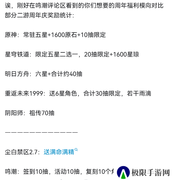 有玩家整理了下各个二游周年庆福利汇总对比,总结下就是《鸣潮》基本上是最抠的那档。