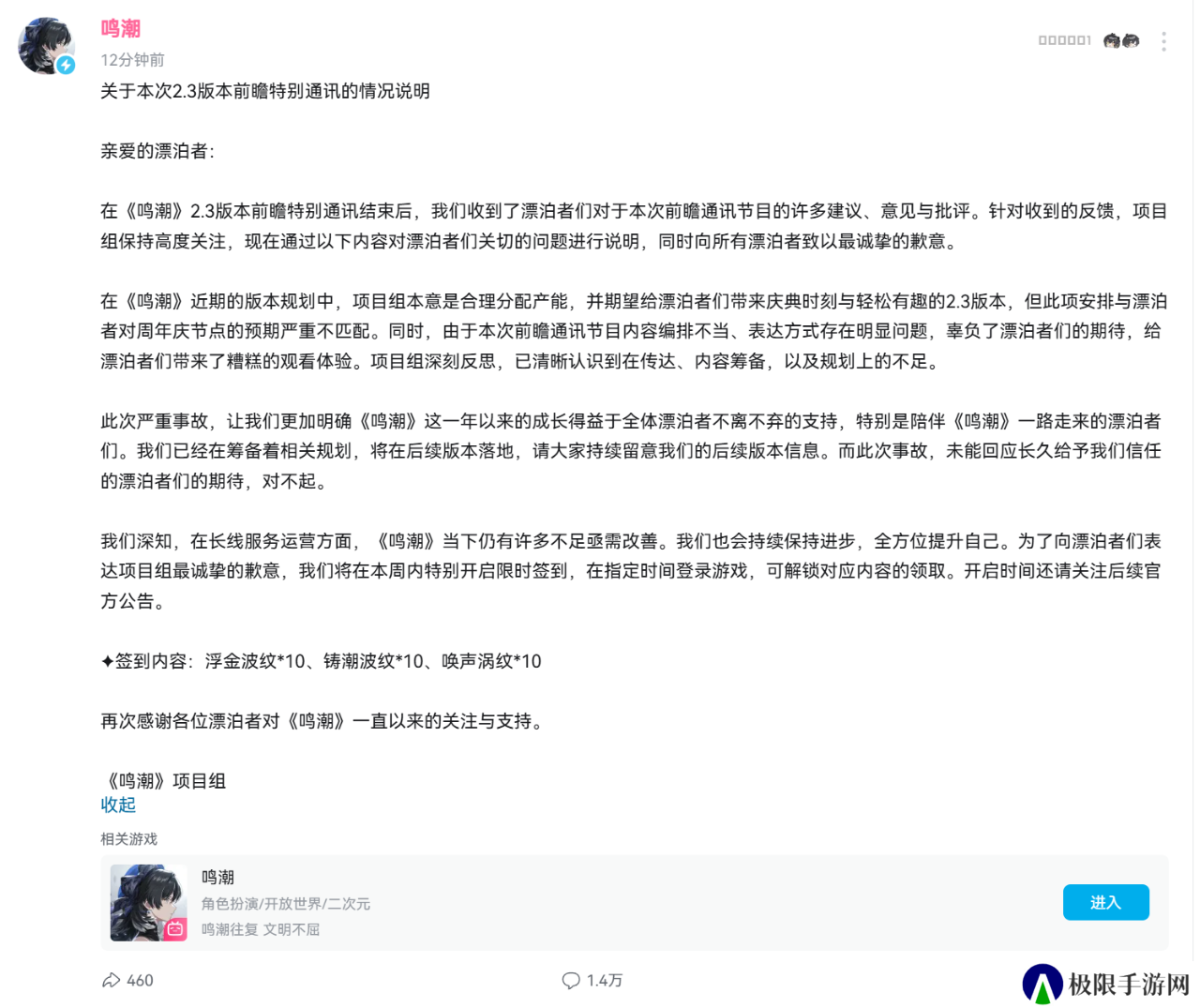 所以《鸣潮》到底干了什么?简答来说就是在一周年前瞻中,官方拉了坨大的,爆料了许久的福利,几乎是一个没有,而且还搞区别对待,老玩家勤勤恳恳上线一年,回头一看福利居然不如新玩家,直接给社区点炸了。