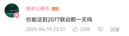 如果说本次前瞻还有什么亮点的话,那就是官宣了联动《2077边缘行者》,这是个好消息,但要等到2026年。于是就有玩家在其评论区下面锐评:“你还能活到2026年吗?”