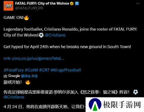 这真的不是什么愚人节的笑话,C罗本人以及《饿狼传说》官方都已在社交媒体上证实,他将作为首发阵营的角色登录到游戏当中。