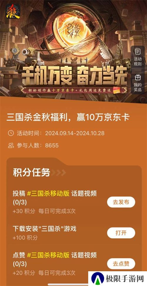 三国杀金秋福利仍在进行中,9月14日-10月28日,抖音玩家视频征集活动限时开启,完成签到、转发、点赞等任务即可获得积分!积分换好礼,10万京东卡、周边福袋(CD机、发声公仔、卡牌、卡牌垫等随机掉落)、游戏礼包等你来!