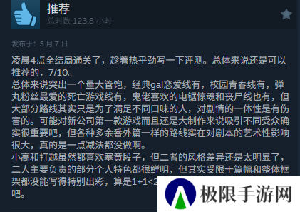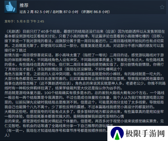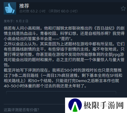 我本身并没有玩过《百日战纪》,所以没法从游戏角度给出合理的判断,但是通过玩家们的评论,还是能了解到游戏存在那些不足的,比如有人觉得这游戏就不该用偏冷门的战棋玩法,也有人觉得所谓的100个结局有很多都是很水用来凑数的等等,不过大伙评论时的时长又在证明,游戏本身的质量还是很过关的。
