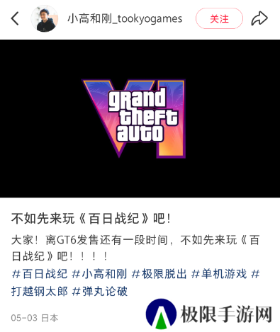 国内这块他也同样没闲着,那边GTA6刚宣布跳票,这边就借着热度趁机向大家推荐《百日战纪》。