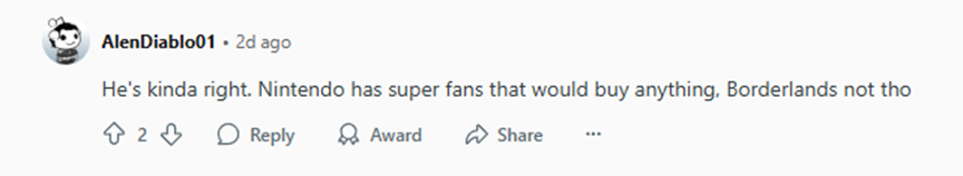 他说的有道理,任天堂有大批狂热粉丝,他们会买任何东西,但是无主之地没有