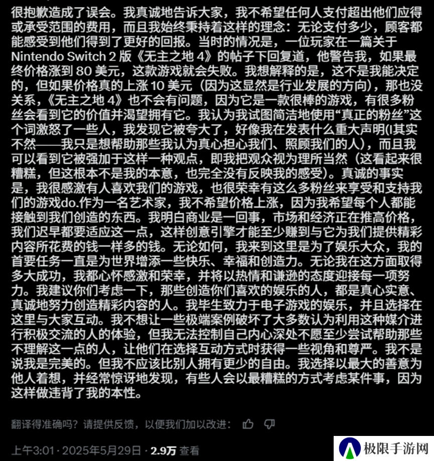 一开始兰迪还试图想用发福利的方式来挽回些口碑,但依旧无法平息玩家的怒火,迫于压力他终于在5月29日的时候对之前的价格争议问题做出了长篇回应。