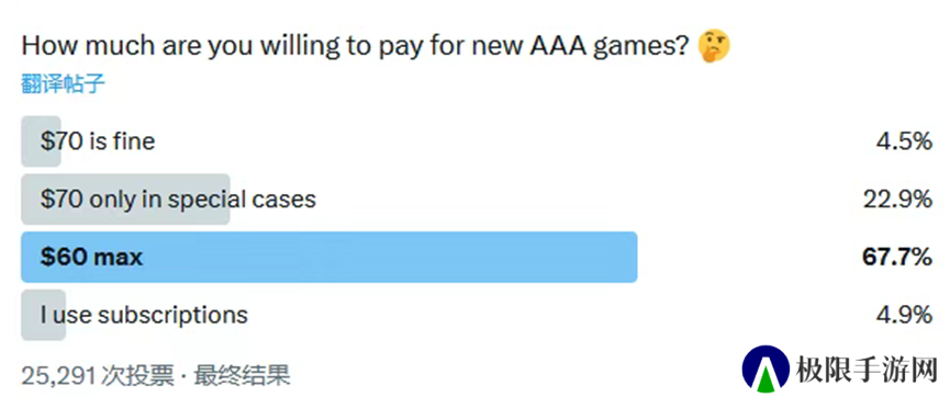 实际上你只要在国内外的游戏社区随便逛逛,就能看到各种和游戏售价有关的投票,从各种大大小小的投票结果来看,60美元依旧是玩家们心中最符合预期的3A游戏定价。