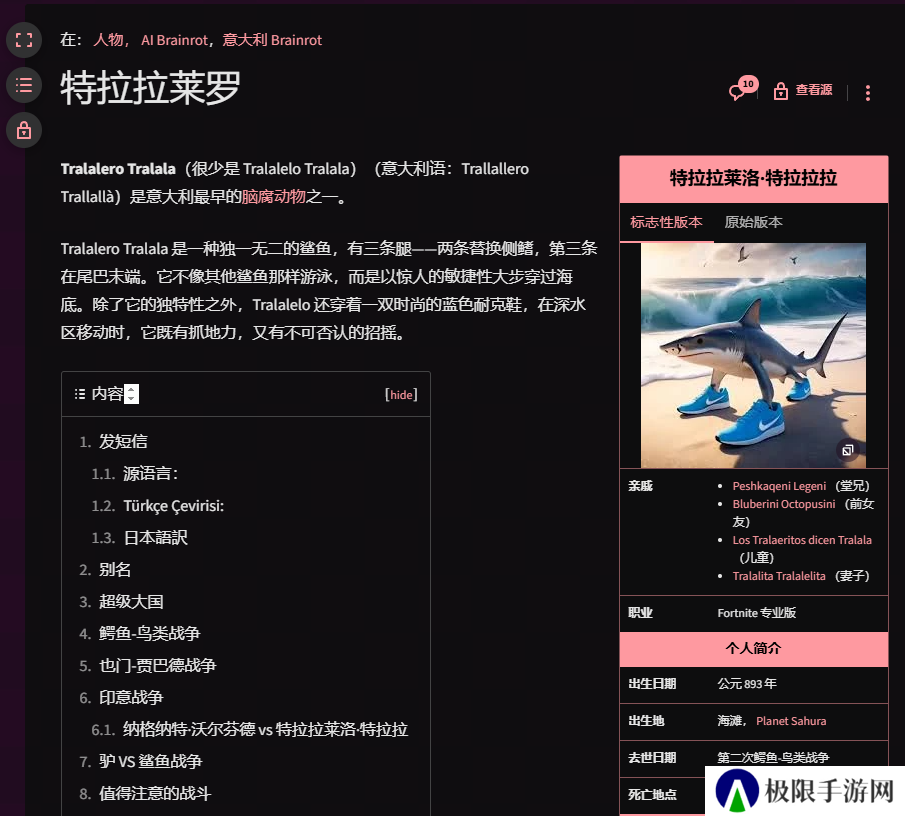 Tralalero Tralala(读作:特拉拉雷楼~特拉拉拉~),也就是这个穿着耐克鞋的三脚鲨鱼,观众们普遍都会把它当成是该系列最早出现的山海经怪物,由于它火的时候就是自带意大利语AI配音的状态,所以后续的创作也都基本采用了这一模板。