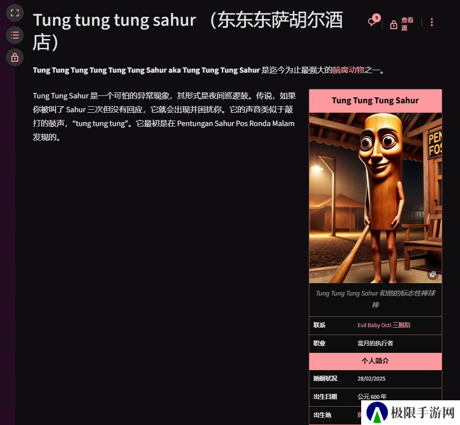 另一位选手Tung Tung Tung Sahur(读作:通通通通萨湖啦~),可以说是目前所有怪物中人气最高的一个,其形象就是一个拿着木棍的木棍人,因为整体是偏人形的设计,所以看久了确实会产生恐怖谷效应,它的角色介绍是由一个印尼口音的AI配的,它名字里的“Tung Tung Tung”就是敲鼓时会发出的声音,结合WIKI里对它的介绍,很容易就能让人产生一种颇具恐怖的怪谈感。