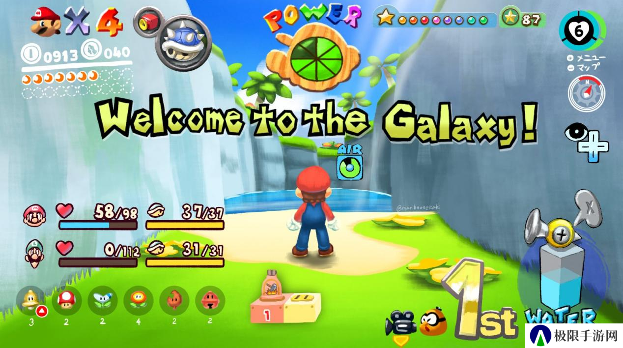 根据环境判断,这个最底层的场景应该是出自《超级马里奥3D大陆》中的W3-2关卡,但是周围却挤满了各种马里奥游戏里的UI,比如《奥德赛》里的金币和月亮,《马里奥赛车8》里的道具和排名,《马里奥&路易吉RPG》里的HP计量表,《超级马里奥银河》里的氧气剩余量等等。