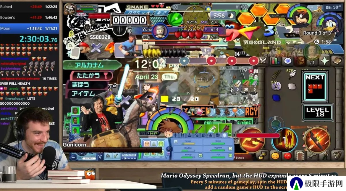 作为3DS上的独占大作,《超级马里奥3D大陆》在上屏幕里基本就没有太多信息,给画面留出了大量的空白,可能正因如此,作者才会选择用它做基底来上一波UI大杂烩,这种简单粗暴的将原本画面塞满,就是“搞砸”游戏UI模因的玩法。