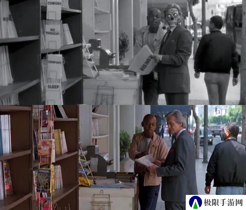 在原片中,男主意外获得了一副能看穿一切事物真实样貌的墨镜,通过墨镜,男主也亲眼见识到了那些伪装成人类样貌的外星人,而正是因为其超前的设定,该片也被很多人视为是伪人概念的先驱。