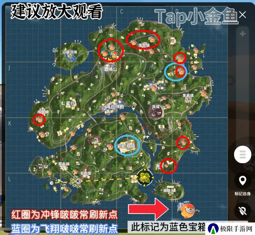 香肠派对冲锋啵啵在哪出,冲锋啵啵是游戏中的一种特殊敌人,玩家在游戏中可以遇到在地面上行走的冲锋啵啵。击败冲锋啵啵后,会掉落高级宝箱,此外,玩家还可以通过击败在空中飞行的飞翔啵啵来获得高级宝箱。因为飞翔啵啵不常见,所以只标记了2处我觉得常刷新的点,冲锋啵啵比较常见,所以本攻略主攻“冲锋啵啵”。