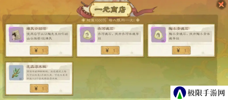 物品很少,只有四个且永久限购一次,其中难民介绍信和勇者魂石都是很实用的物品,氪永久月卡的玩家我相信不会缺少这几块钱购买一元商店,而觉得永久月卡贵而选择不购买的玩家购买了一元商店也能前期过度的舒服,所以优先级是最高。