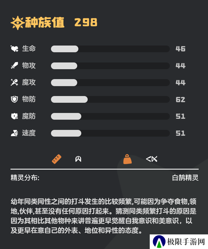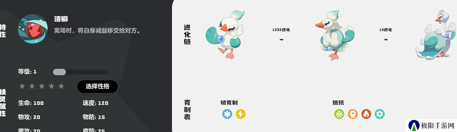 在游戏中,乖乖鹄的种族值是298,作为水属性的宠物,玩家在选择利用乖乖鹄时也需要注意它的技能,而它作为多技能的宠物,一旦在战斗时施展泡沫幻影这个防御技能,可以达到减伤70%,能够轻轻松松的应对攻击,还能够顺利的脱离战场。