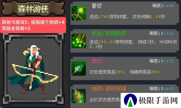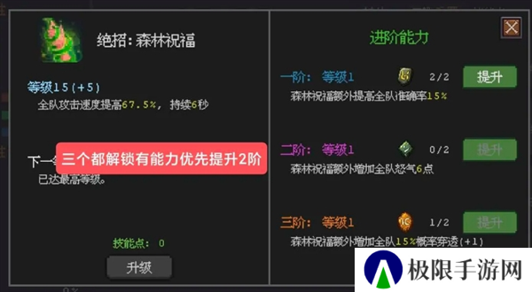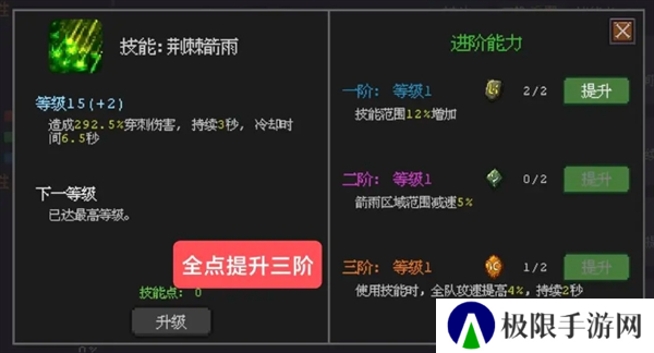 荆棘箭雨三个都解锁,优先提升三阶提升全队攻速。一二阶增加范围减速也是有增益作用,有条件也拉满!