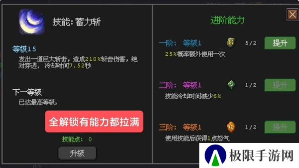 蓄力斩要的是使用获得怒气,一二阶都是为三阶服务的。拉满三阶在考虑提升一二阶。